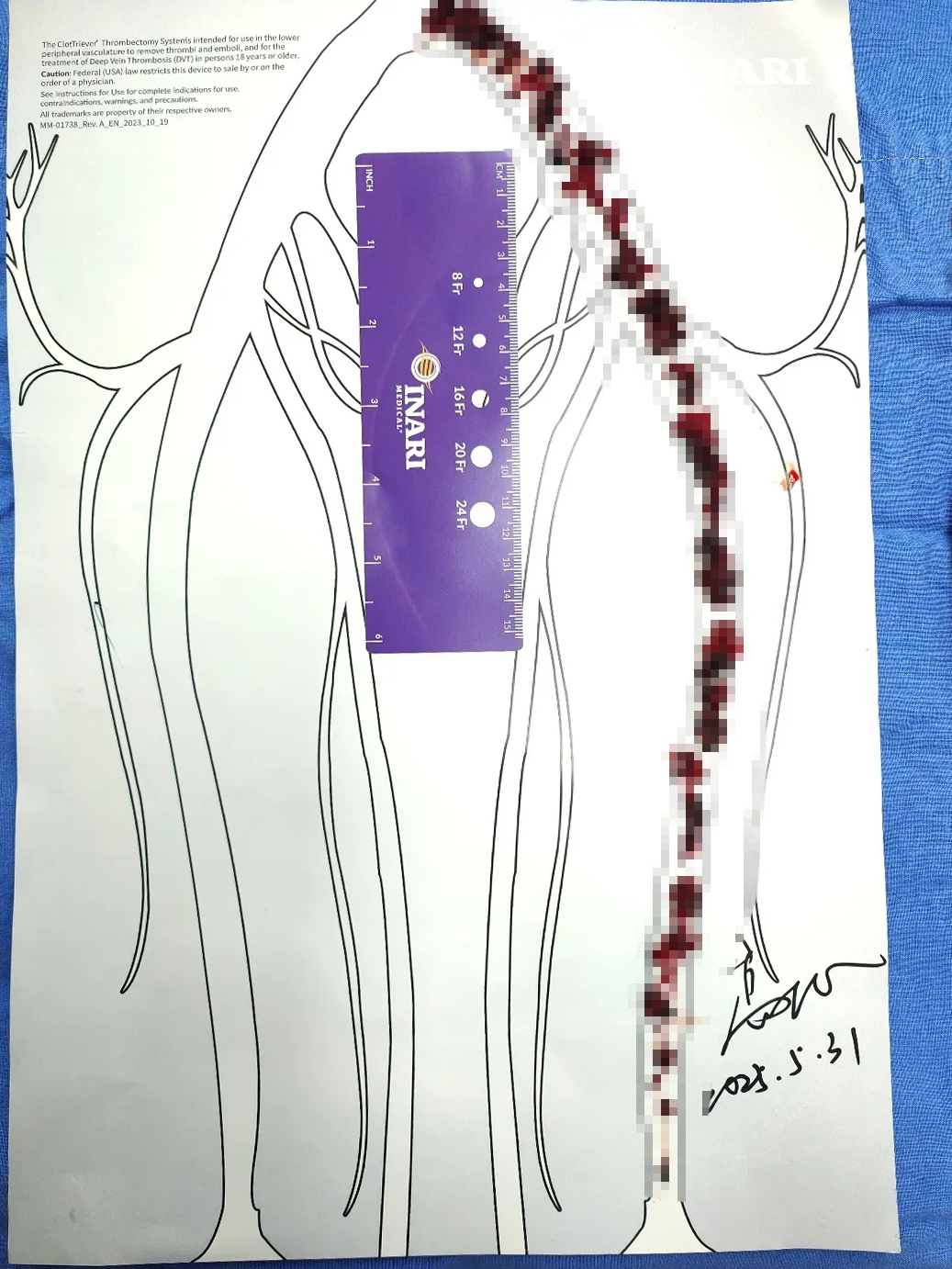 经影像检查后发现,患者左下肢从大腿根到小腿整条静脉里都有血栓!患者发病短,属于急性血栓,且血栓负荷量大。