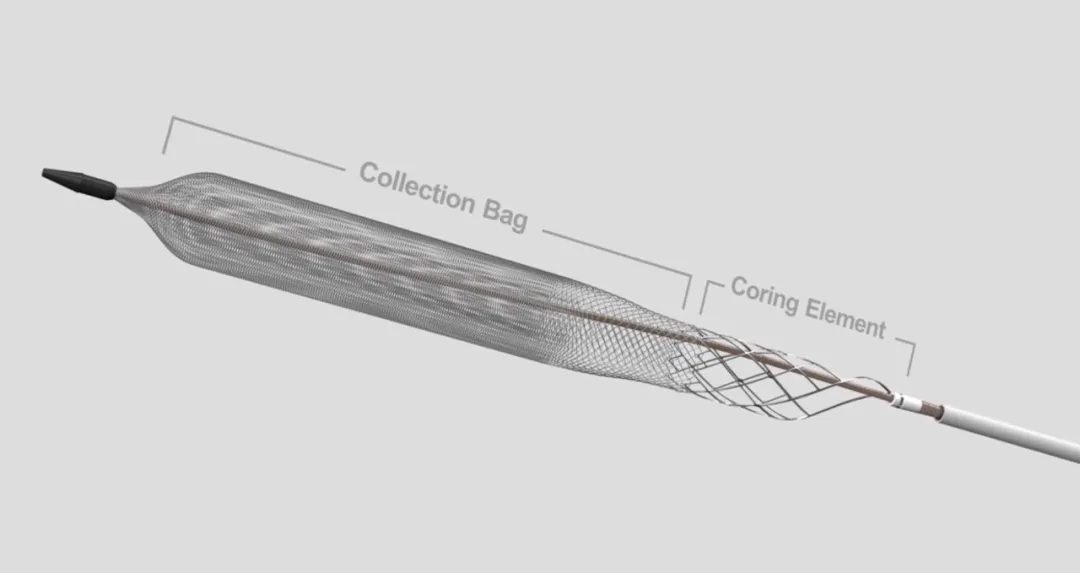 ✔ 支架如同一个灵活、柔软的钢丝球,进入静脉血管刮去并带出血管内的血栓。其近段为激光雕刻自膨镍钛支架,采用30-45°斜面开口设计,能安全有效分离管腔内及附壁血栓,同时不损伤静脉瓣膜和血管壁。