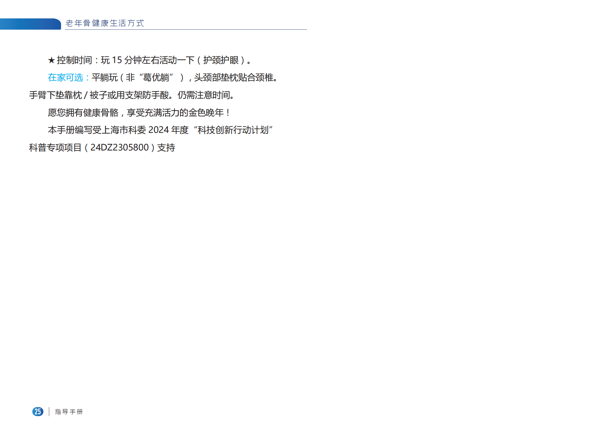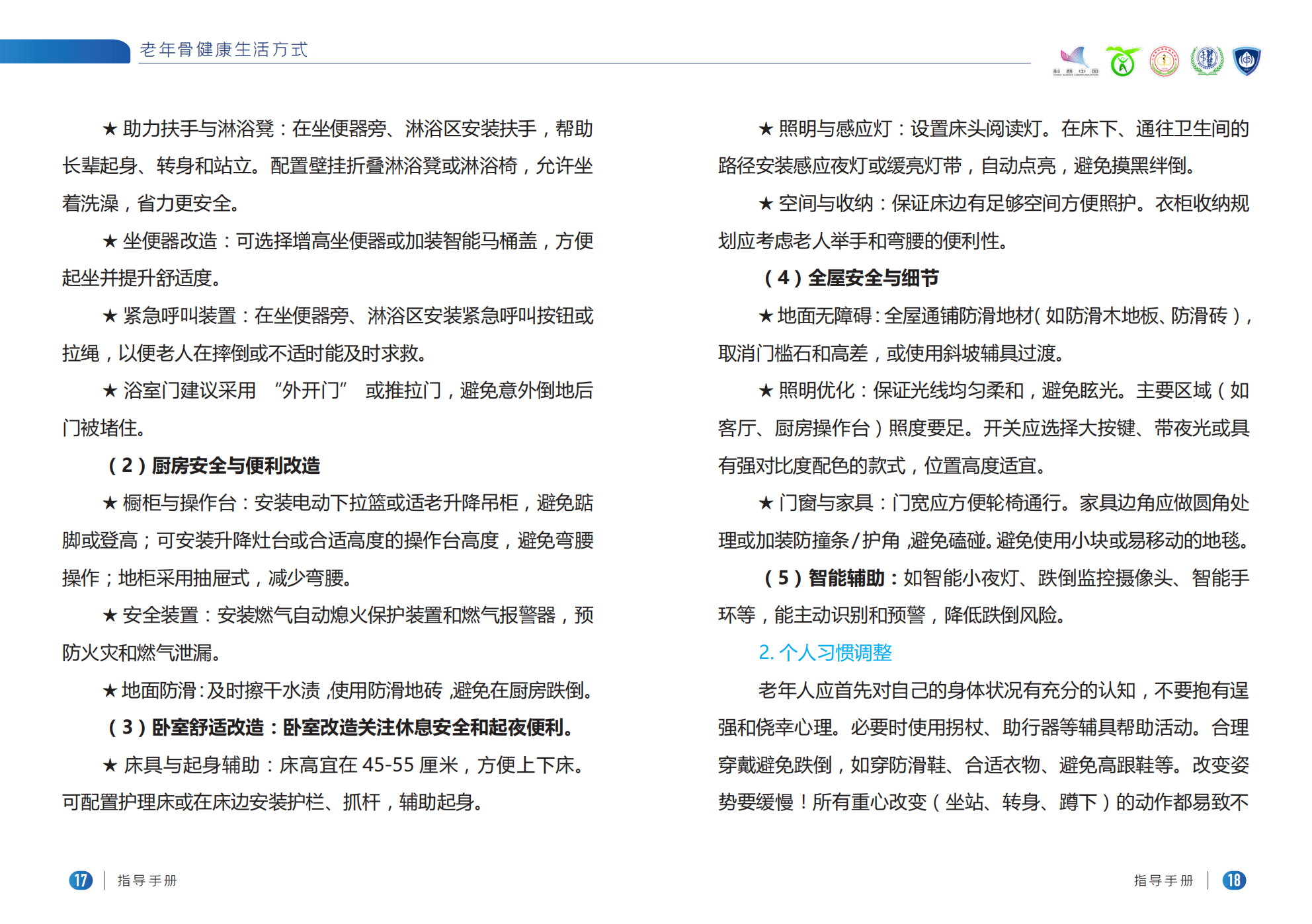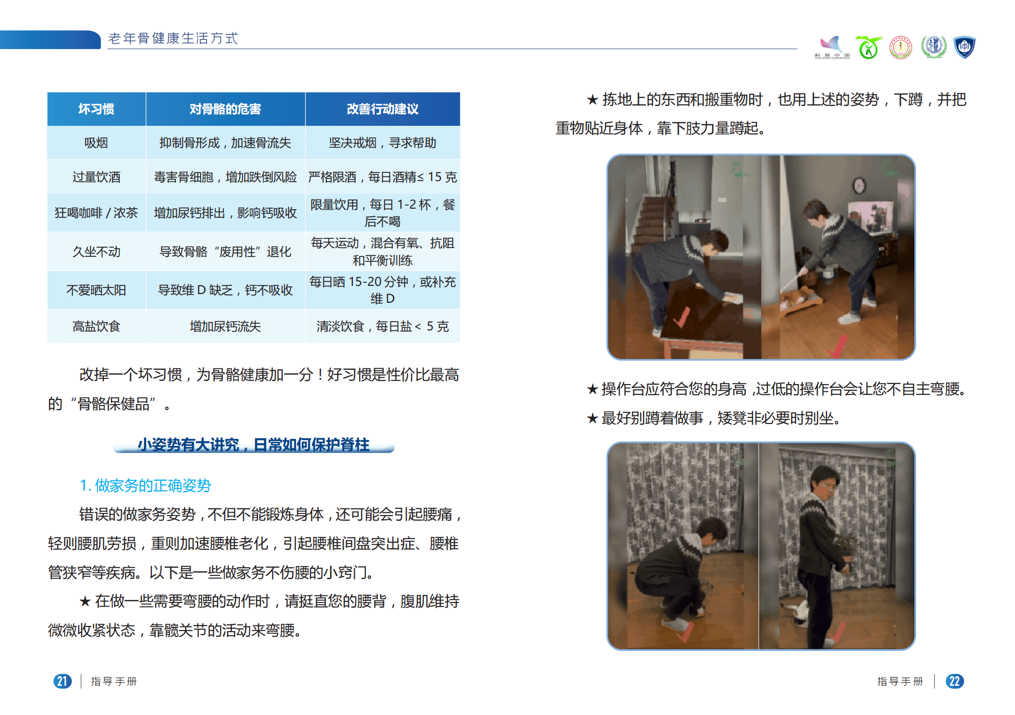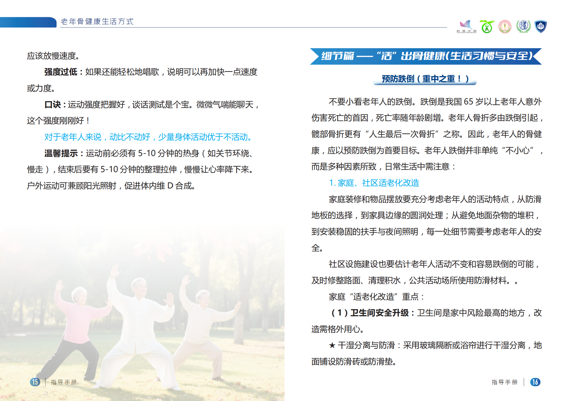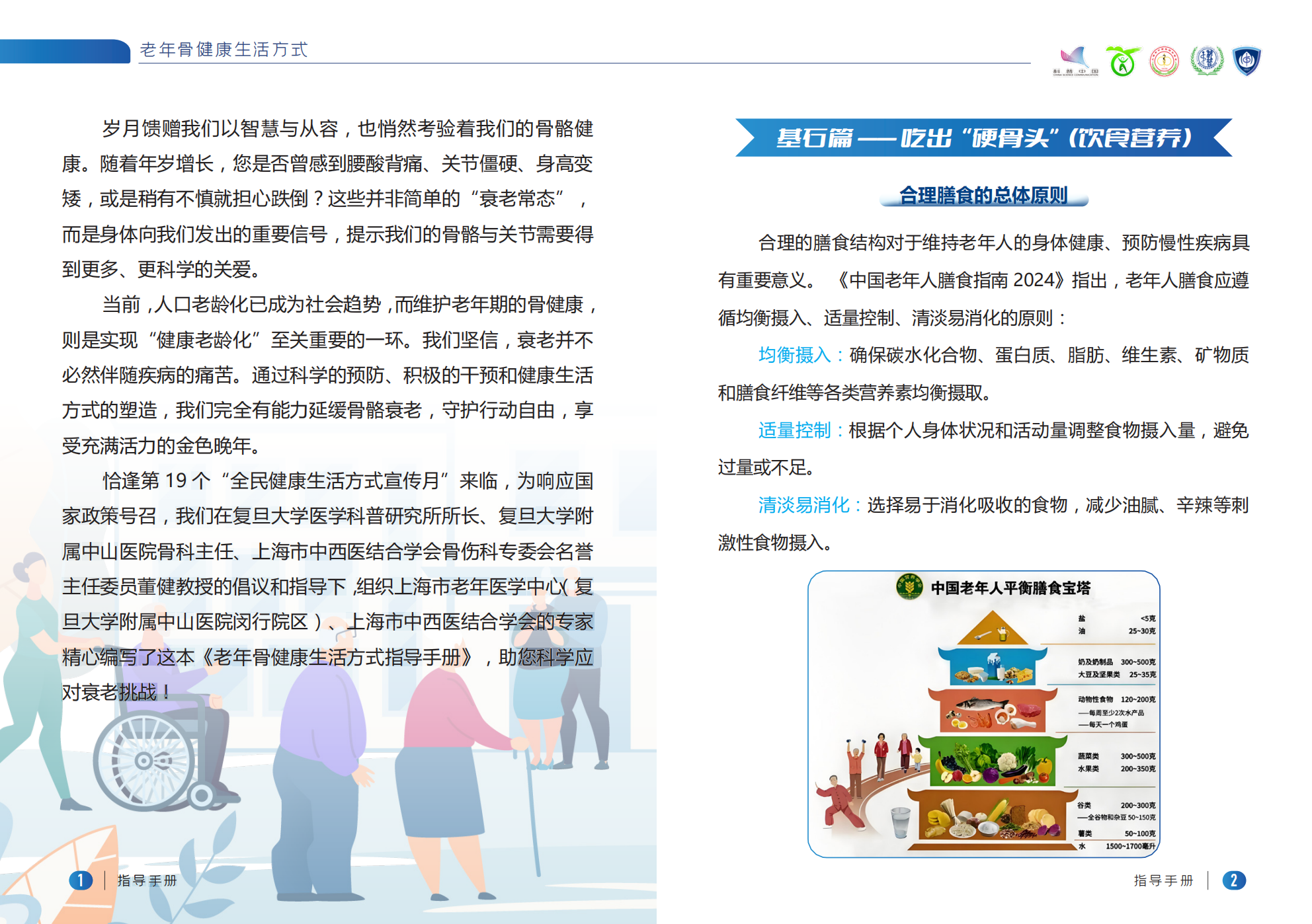 《老年骨健康生活方式指导手册》由复旦大学附属中山医院、上海市老年医学中心骨科主任董健教授倡议指导,沪上老年医学和中西医结合专家共同编写,从吃饭怎么补、运动怎么练,到日常怎么防,手把手教老人养成护骨好习惯,旨在帮助老年人破除误区、增强自我保健意识,全面提升老年人群健康管理能力。