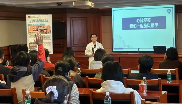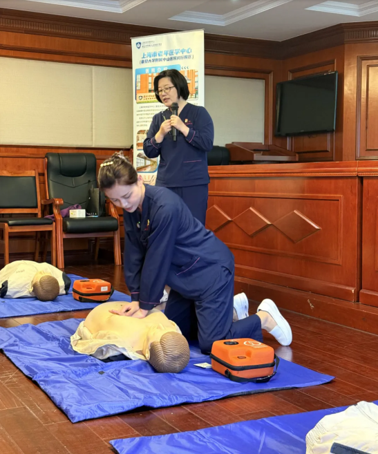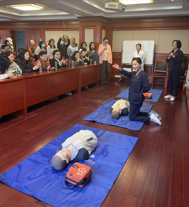 实操培训环节,上海市老年医学中心护理团队采用讲座与场景模拟相结合的讲解方式,现场演示心肺复苏(CPR)标准流程及AED的正确使用方法。三位护理人员结合模拟突发场景,从胸外按压的正确姿势,按压深度、频率,到开放气道、人工呼吸的规范动作,细致拆解每一个操作要点,现场学员纷纷上前围观学习,气氛十分热烈。